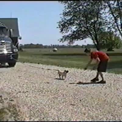 Small dog looks like he's pulling a big semi truck. Funny visual. Set up.