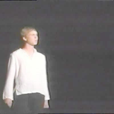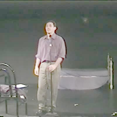 A young man sings in a show and his microphone flies out of the microphone stand and hits a wall. He continues to sing without the microphone and finishes his performance.
