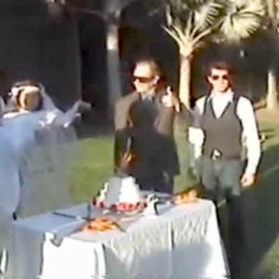 Groom picks up bride and spins around at outdoor reception, falls over and drops her on cake on folding table. Possibly staged.