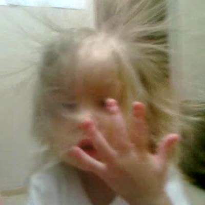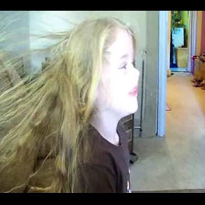 Young girl holds onto an electric generator in the kitchen, her hair stands straight up from static electricity. She runs away, afraid of being photographed. Long for edit.