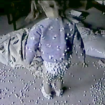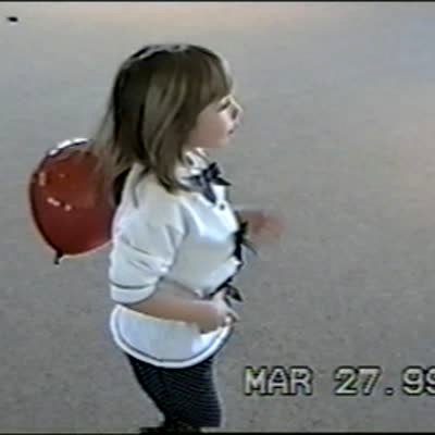 Young girl pops balloons by sitting on them, One sticks to her hair and she doesn't know where it went. She spins around looking for it.