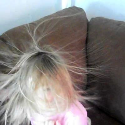 A tot girl plays on a couch and her hair all stands on end because of the static electricity she created indoors.
