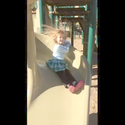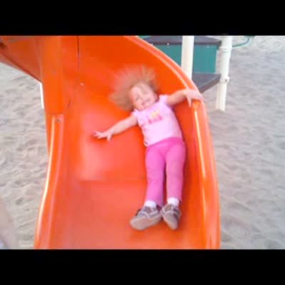 A young girl goes down a slide at a playground, then her hair stands straight up from static electricity.