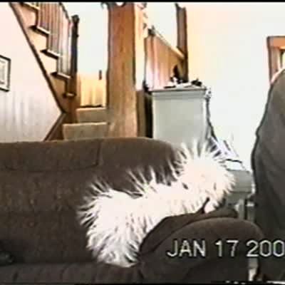 A dog scratches at its dog bed in a living room. The woman with the camera calls to the dog and it lifts its head up and its hair sticks out all over the place.