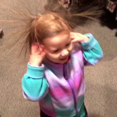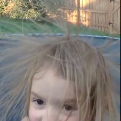 A tot girl crawls on a trampoline outdoors and her hair stands up straight until she touches her mom's hand and a shock from static electricity causes her hair to go back down.