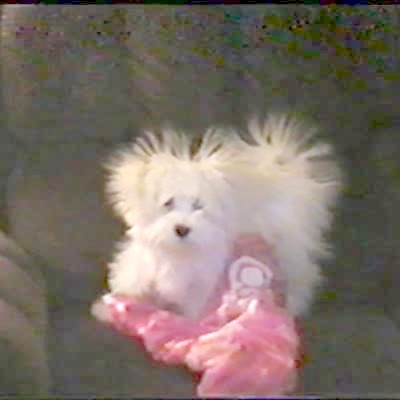 Small white dog plays with plastic bag & gets static electricity. Dog's hair stands straight up. Funny visual.