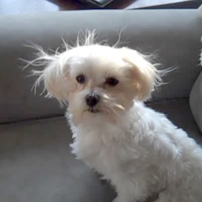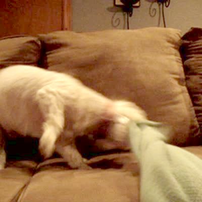 Maltese dog on couch plays with blanket, hair on ears and tail stands up from static electricity.