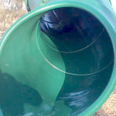 A young girl enters a playground jungle gym and goes down the slide. On the way down her hair puffs out from all the static electricity.