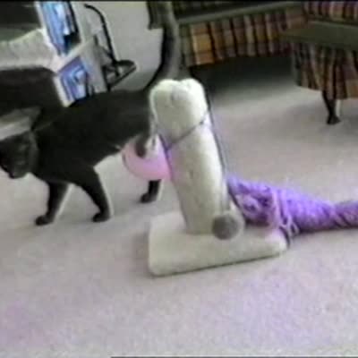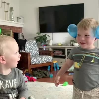 In a living room, two tot boys use static electricity as the ask Alfonso for more balloon videos.