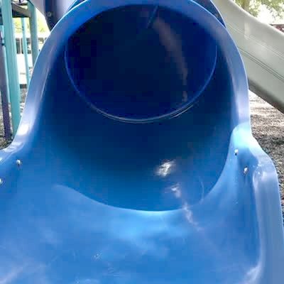 A girl goes down a spiral slide and when she reaches the bottom, her hair stands on end from static. Her sister goes down after her and does the same.