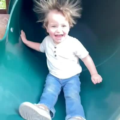 A little boy slides down a plastic slide on a playground outdoors and the static electricity makes his hair stand perfectly up on end.