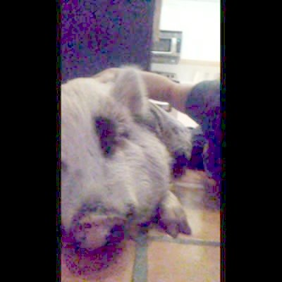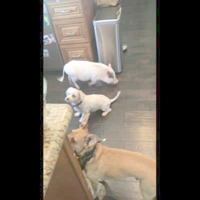 A woman kisses her pet pig named Juanita and the pig grunts at her.