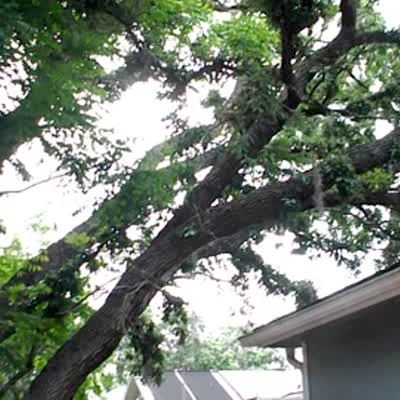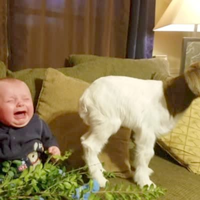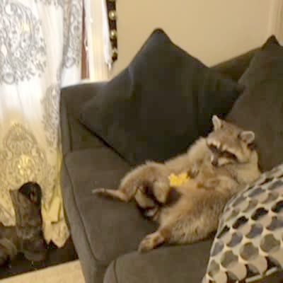 A woman cuddles with a raccoon on a bed. A man off-camera makes a scary sound and the raccoon turns his head.
