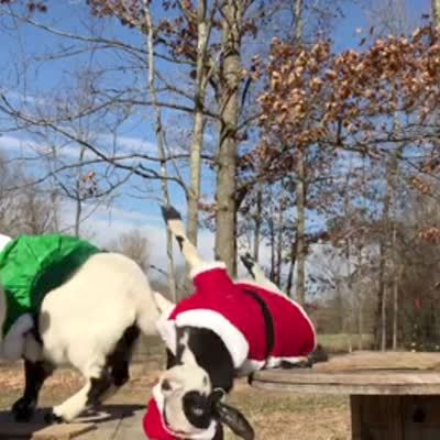 Three fainting goats wear Christmas costumes and two of them fall over.