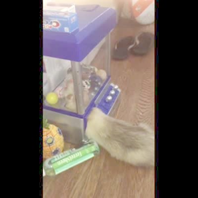 A young girl plays with a pet raccoon and it slaps her on the butt.