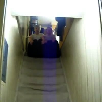 2 boys fall down the stairs while trying to sled down on a doggie bed. Steps. Boneheads.