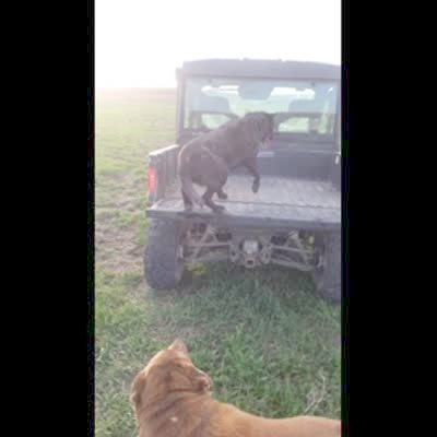 A dog jumps on the back of a gator 4 wheel bed, another dog tries to jump up and falls down.