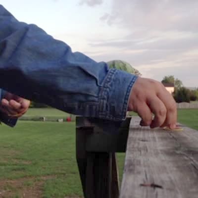 A man and a young boy put rubber bands on a watermelon until it explodes in slow motion.