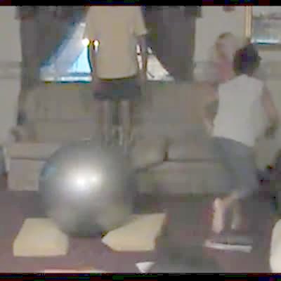 4 kids jump on an exercise ball inside house. Boy says "action," another boy jumps from the couch to the ball and lands on his butt, falling off.