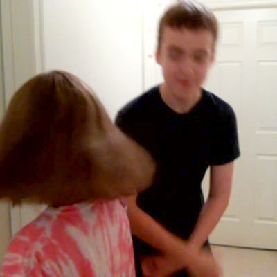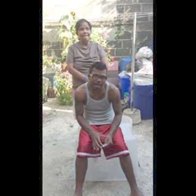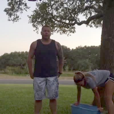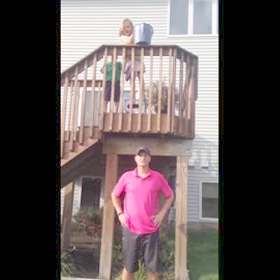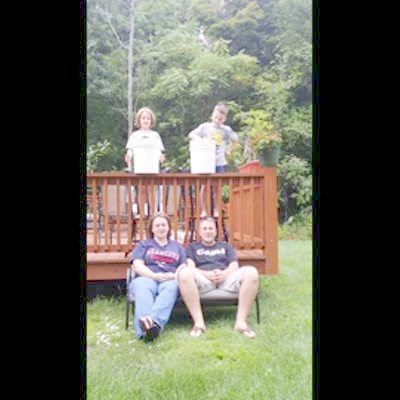 A man sits in a lawn chair for an Ice Bucket Challenge before his son and two daughters try to push a cooler of water over the porch railing behind him at 1:05:00. When it won't move, they whine that they can't do it and the boy pushes harder, causing the entire cooler to fall on the man's head before a younger child is heard crying. ALS Ice bucket challenge.