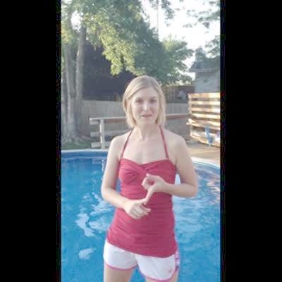 An adult woman participates in the ALS Ice Bucket Challenge and the person who is supposed to dump the water on her, drops the full bucket on her head and she falls into the pool outdoors.