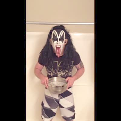 A man wears a KISS mask in his bathtub indoors and nominates friends for the ALS Ice Bucket Challenge before he dumps a bowl of ice and hits the shower pole, causing the ice to fall out on the floor. ALS Ice Bucket Challenge
