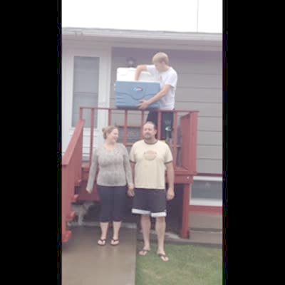 A teen boy accidentally falls off of a porch and breaks the railing while trying to dump a cooler of water on his parents below him outdoors. ALS Ice Bucket Challenge.