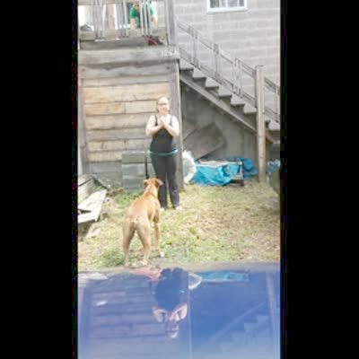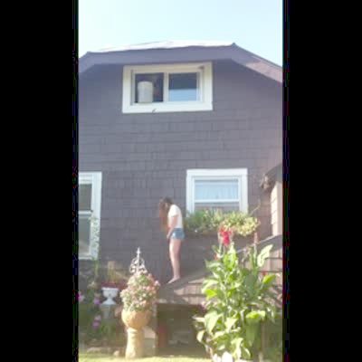 A woman dumps a bucket of ice water out of a window on a teen girl on the roof of a house. She slips and falls down. ALS Ice Bucket Challenge.