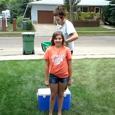 A teen girl announces her ice bucket challenge outdoors while another girl stands on a bucket next to her and dumps a bucket of water on her before the bucket she's standing on tips over and the girl falls down. ALS Ice Bucket Challenge. Vine/instagram