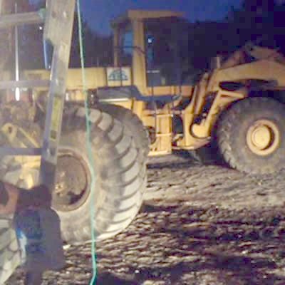 A shirtless man stands in front of a tractor loader bucket outdoors. The tractor dumps the water inside of the bucket over him and the water knocks the man over. ALS Ice Bucket Challenge.