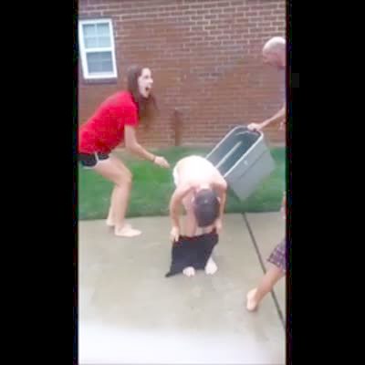 A teen girl and her dad dump a large bucket of ice water on a young boy outdoors and his shorts fall down. They all laugh. ALS Ice Bucket Challenge.