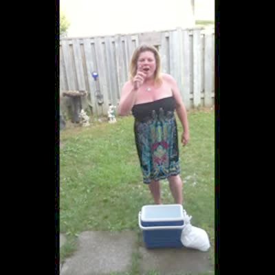 A woman dumps a cooler of ice water on her head outdoors and the top of her dress falls down. ALS Ice Bucket Challenge.