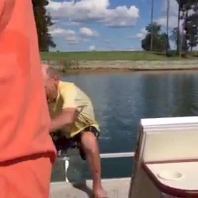 A man sitting on a boat falls off backwards when another man pours a bucket of ice water over him. ALS Ice Bucket Challenge.