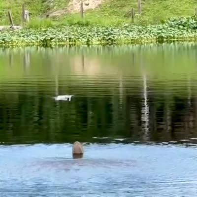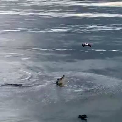 A baby alligator looks at a drone that hovers above the water. The alligator leaps up and eats it.