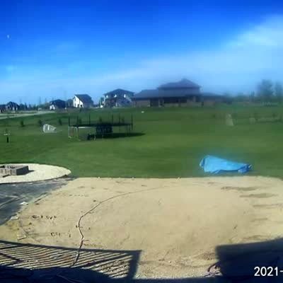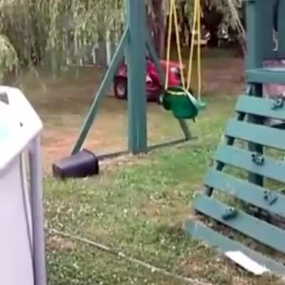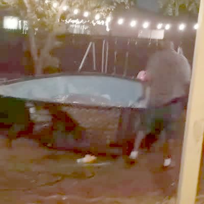 The wind makes an above ground pool fly up and hit a man in a backyard. Graphics.