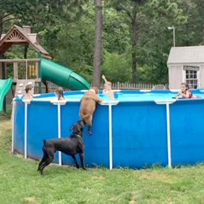 An English Bulldog tries to stand on another dog to get into an above ground pool.