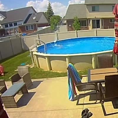 A man climbs out of an above-ground pool, but the ladder breaks and he falls on the grass. Security footage.