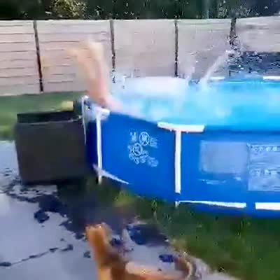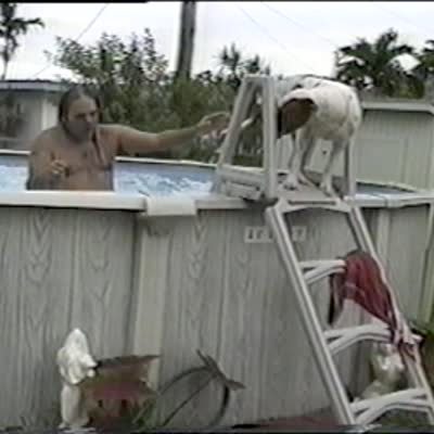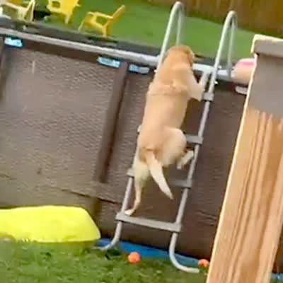 A dog exiting an above ground swimming pool falls to the ground when the ladder collapses.