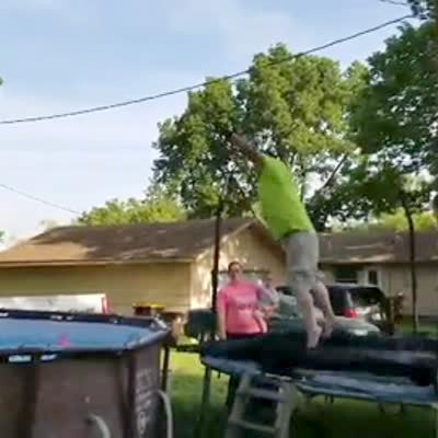 A man tries to jump from the trampoline into the above-ground pool but he doesn't make it all the way and he lands on the pool wall with his groin.