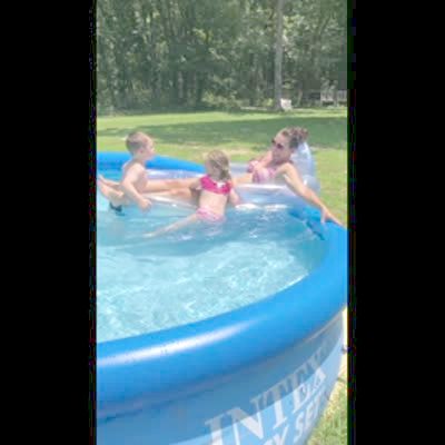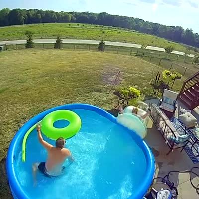 Action ends at 30 seconds. A woman sits on a raft in an inflatable pool, and then a man tries to sit on the raft with her but it floats over the edge and the woman falls out of the pool.