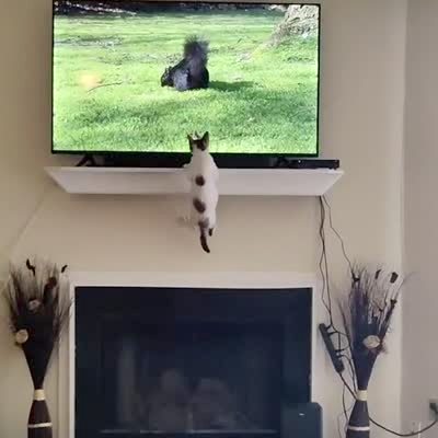 A cat watches a squirrel on a television mounted above a fireplace in the living-room. The cat leaps up and hangs from the fireplace mantle.