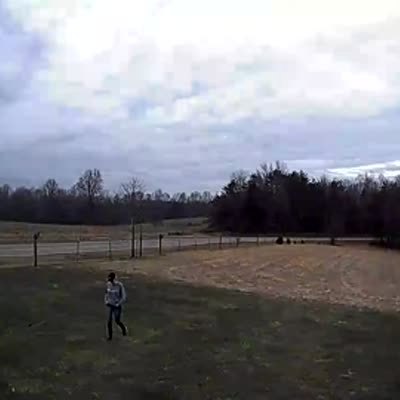 A teen boy flies a drone above his house. His mom walks through the front yard, and the drone flies into her face and crashes to the ground. Video from drone, no audio.