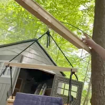 A man shows a swing he built in the backyard, and when he sits on it the beam above him breaks.