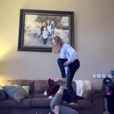 A young girl lays on her back with her feet in the air and another young girl stands on the couch above her and tries to balance on her feet and she falls in the living-room.