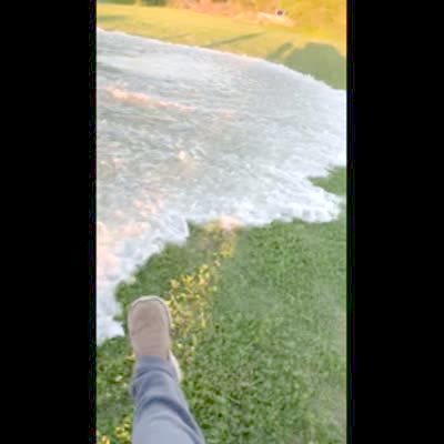 A man dives into an above ground swimming pool and cuts a hole in it from the inside. It rips apart and the man floats out along with all the water after he and a woman joke about being born. The backyard is flooded.