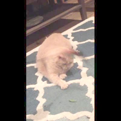 A cat lays on the living room floor and swats at a toy that its owner holds above it. Another cat off screen jumps and attacks the first cat and the first cat gets scared and runs away.