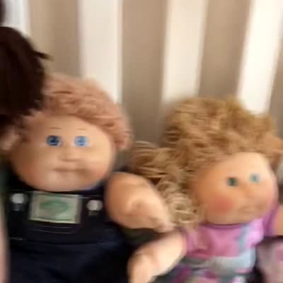 A woman films a row of Cabbage Patch dolls in the bedroom, and her baby girl sits in the center with a wig on.