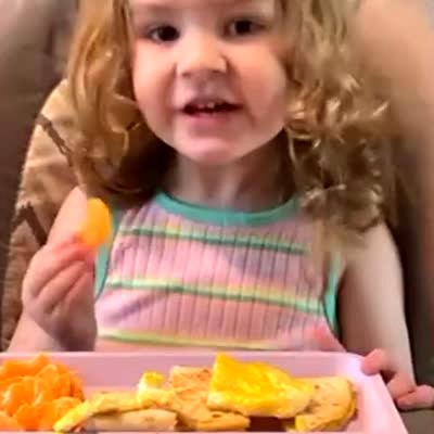A tot girl sits at a table and eats an orange slice. A woman says, "You're adorable." The tot responds, "I�m not adorable, I�m frickn' cute!"