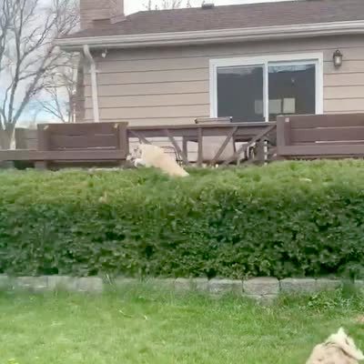 A puppy dog runs back and forth across the top of a bush in a yard.