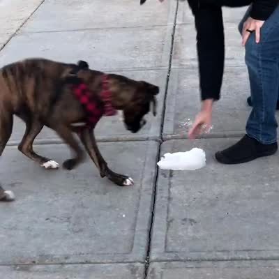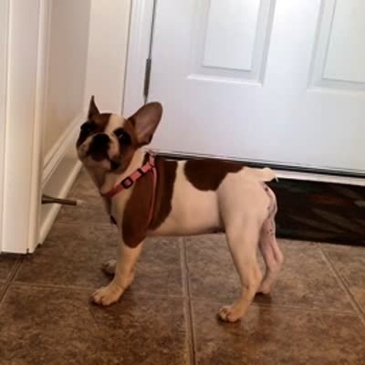 A dog shakes and jumps back with excitement each time his snack bag is popped open. Compilation of several videos.